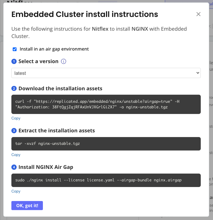 In the Vendor Portal, go back to the customer's page (Applications > NGINX > Customers > Nitflex) and reopen the Embedded cluster install instructions dialog.